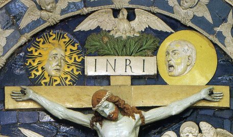 Ebbene, è proprio la scena della Crocifissione nel santuario che attira il nostro sguardo. Nell’opera del 1481 vediamo raffigurati i personaggi storici, cioè Gesù inchiodato alla croce, la Madonna e il discepolo Giovanni. Poi, inginocchiati, ecco San Francesco (il “padrone di casa”, potremmo dire) e San Girolamo, esempio di vita penitente. Ai piedi della croce, come in una piccola grotta, appare un teschio: è il vecchio Adamo, cioè l’umanità, che viene purificato e salvato dal sangue di Gesù. In alto notiamo, immediatamente a contatto della croce, il pellicano, simbolo di Gesù che dona la propria vita, e, ancora più su, la colomba dello Spirito Santo. Accanto al Crocifisso, un gruppo di angeli piangenti, come il coro di una tragedia greca. Infine, ed ecco il particolare che ci interessa, a destra e a sinistra di Gesù, nella zona superiore, notiamo due teste maschili: quella del Sole e quella della Luna.
